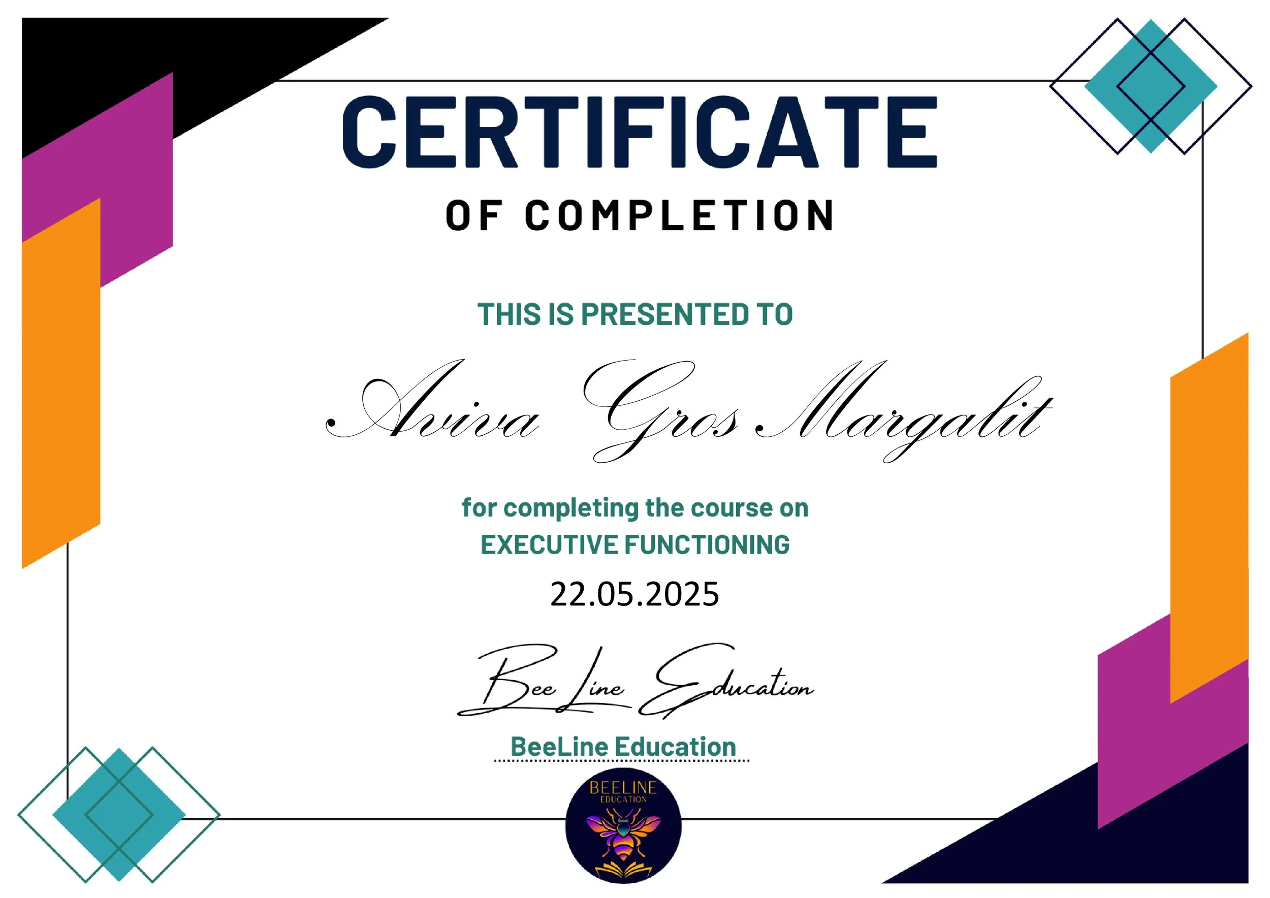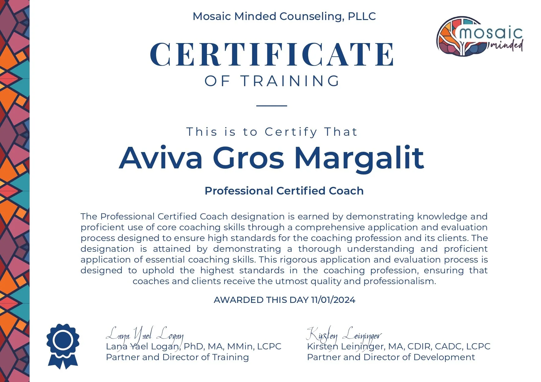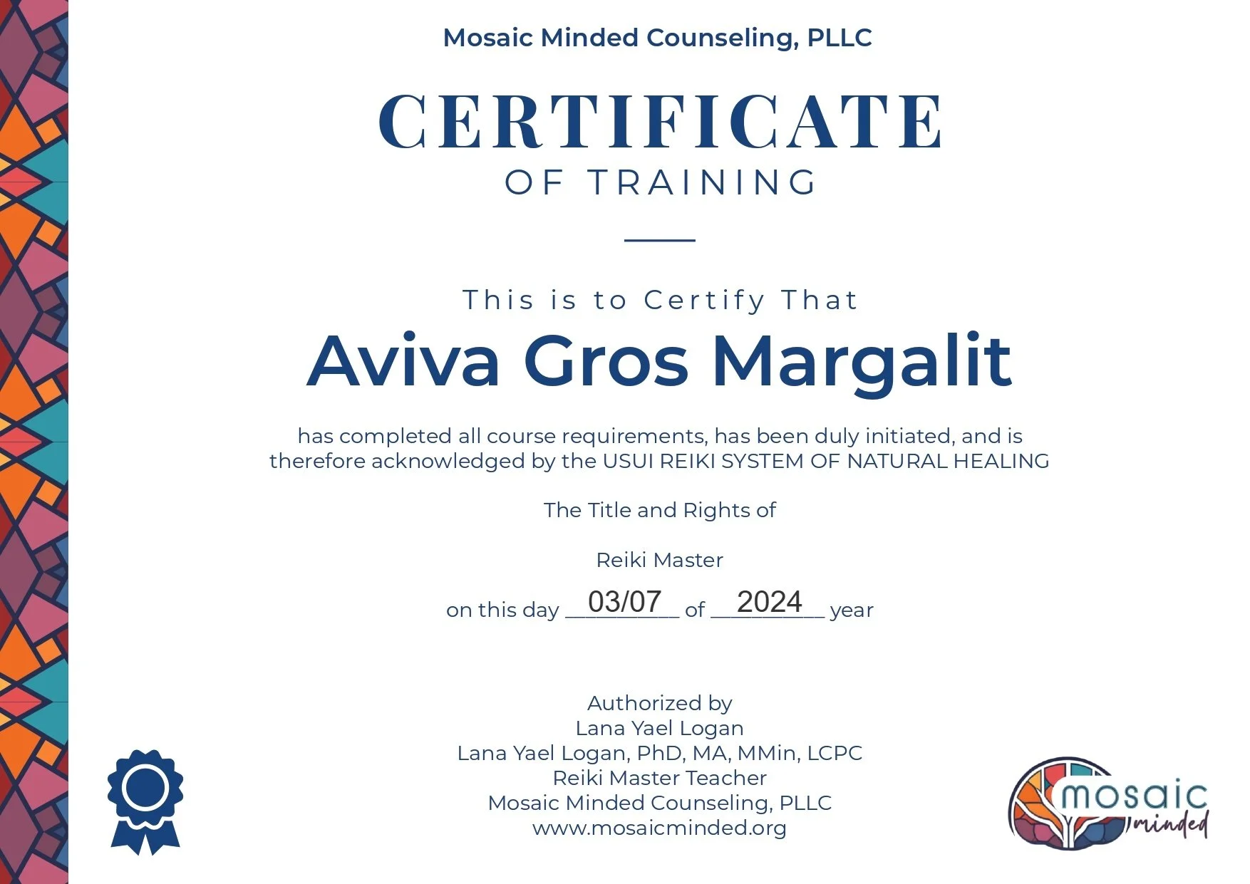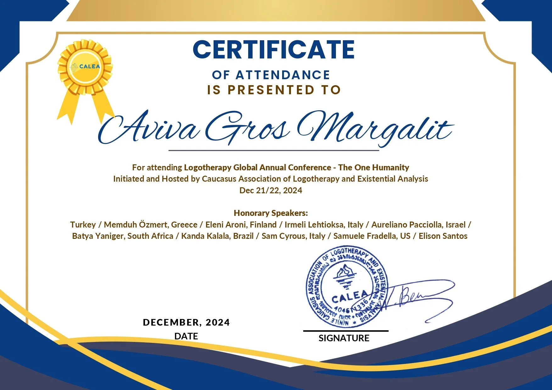 אני לוגותרפיסטית מוסמכת, ובימים אלה בתהליך לקבלת הסמכת דיפלומט מטעם המכון ללוגותרפיה ע"ש ויקטור פרנקל. בנוסף, אני מנחה קבוצת לוגותרפיסטים בינלאומית חודשית, שבה אנשי מקצוע מרחבי העולם חולקים ידע, תובנות ותמיכה הדדית.