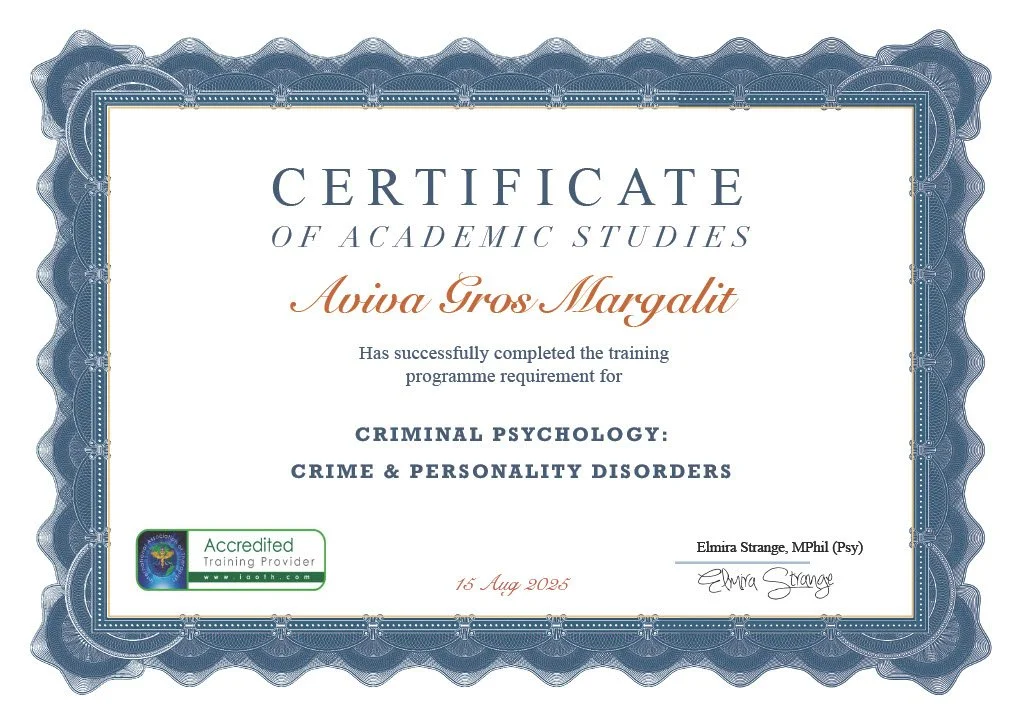 - • פסיכולוגיה פלילית ופורנזית (בדגש על ילדים, מתבגרים והפרעות אישיות)